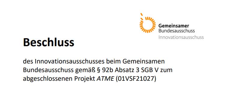 Am 19. November hat der Innovationsausschuss beim Gemeinsamen Bundesausschuss die gezielte Weitergabe der Ergebnisse des ATME-Projektes [Förderkennzeichen: 01VSF21027] an die in diesem Versorgungsfeld relevanten Stakeholder beschlossen.