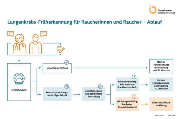 Für Raucherinnen und Raucher wird im nächsten Frühjahr die Lungenkrebs-Früherkennung mittels Niedrigdosis-Computertomographie (NDCT) eingeführt. Starke Raucherinnen und Raucher im Alter zwischen 50 und 75 Jahren können dann alle 12 Monate eine Untersuchung der Lunge wahrnehmen. Außerdem wird der gemeinsame Bundesausschuss (G-BA) eine Versicherteninformation zur Verfügung stellen. Ein Workflow wurde bereits skizziert und ist, neben weiteren Informationen, auf der Website des G-BA zu finden: https://www.g-ba.de/presse/pressemitteilungen-meldungen/1263/